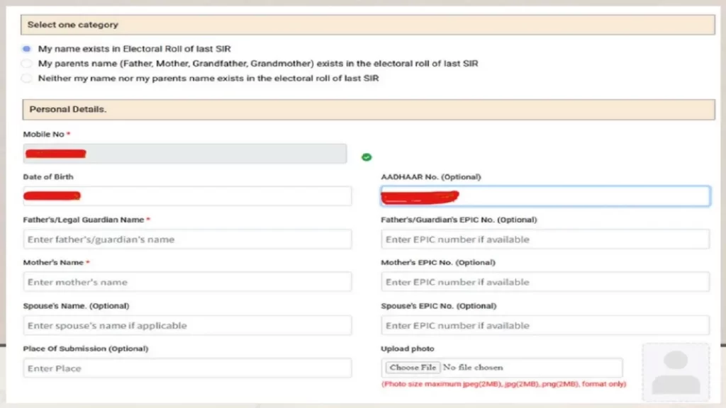 स्टेप 5: उपयुक्त कैटेगरी चुनें (SIR Form Online)